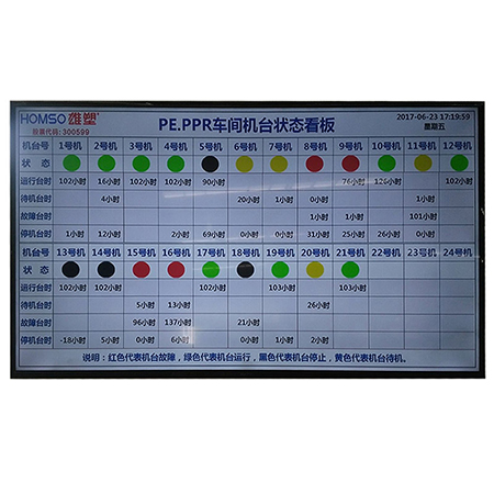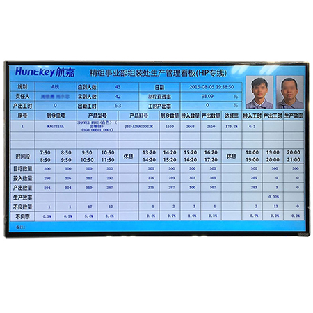 傳統電子看板使用LED屏,顯示數據少,內容單一,并且無法將多條產線組成網絡,進行集中管理和數據存儲。我司研發的液晶電子看板,采用高分辨率,顯示內容豐富,色彩和布局可根據客戶喜好進行設計,同時可通過以太網/無線網絡將工廠內的所有電子看板進行集中管理,并且將實時的生產數據上傳到服務器,管理人員在辦公室就可以實時查看生產進度,返修率等數據。